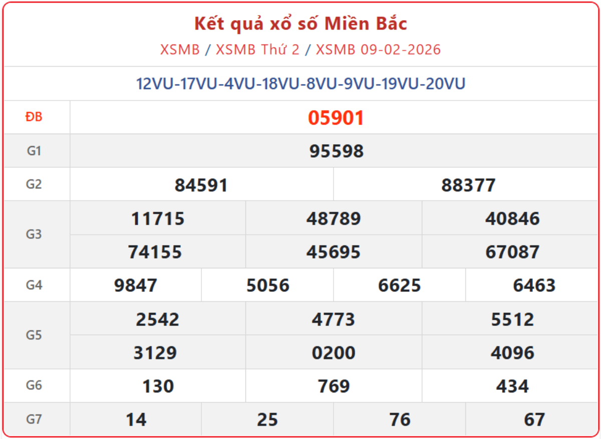 - Xổ số miền Bắc mới nhất ngày 9/2/2026. Xem lại KQXSMB ngày 9/2/2026