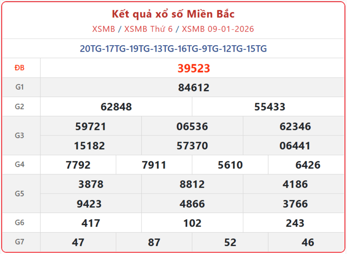 XSMB 9/1, kết quả xổ số miền Bắc (KQXSMB) ngày 9/1/2026.