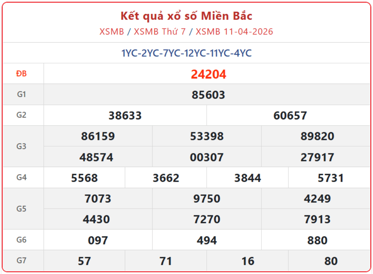 XSMB 11/4, kết quả xổ số miền Bắc (KQXSMB) ngày 11/4/2026.
