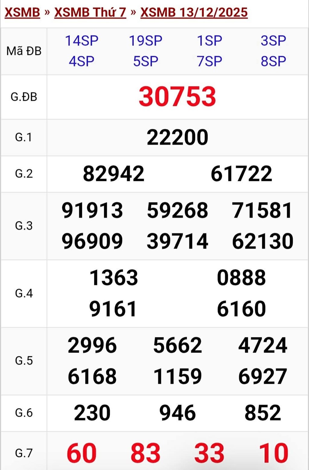Kết quả xổ số miền Bắc ngày 13/12. KQXSMB 13/12/2025. XSMB 13/12.