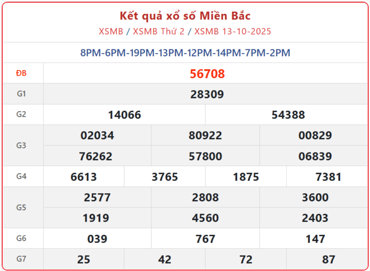 XSMB 13/10, kết quả xổ số miền Bắc (KQXSMB) ngày 13/10/2025.