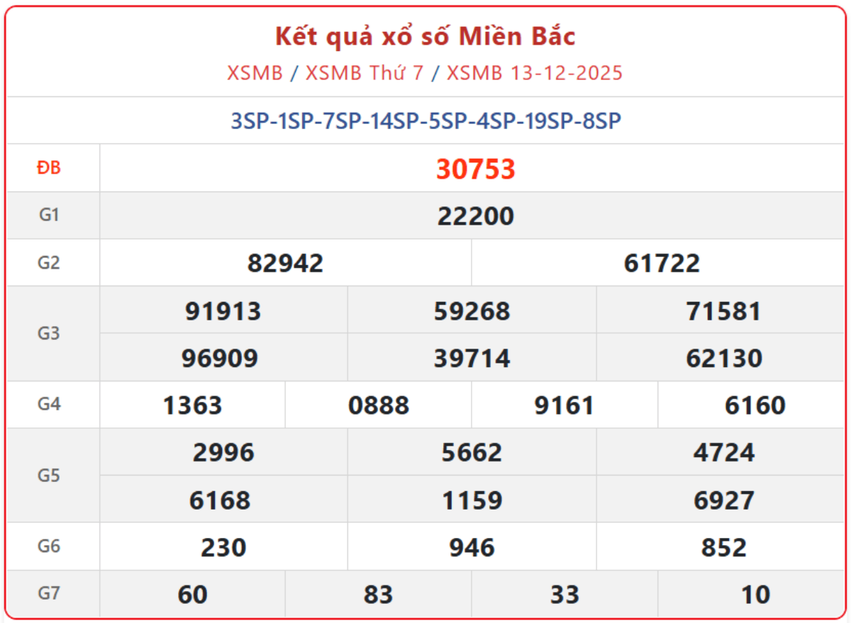 XSMB 13/12, kết quả xổ số miền Bắc (KQXSMB) ngày 13/12/2025.