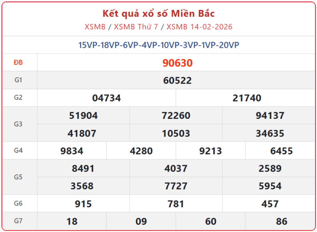 XSMB 14/2, kết quả xổ số miền Bắc (KQXSMB) ngày 14/2/2026.