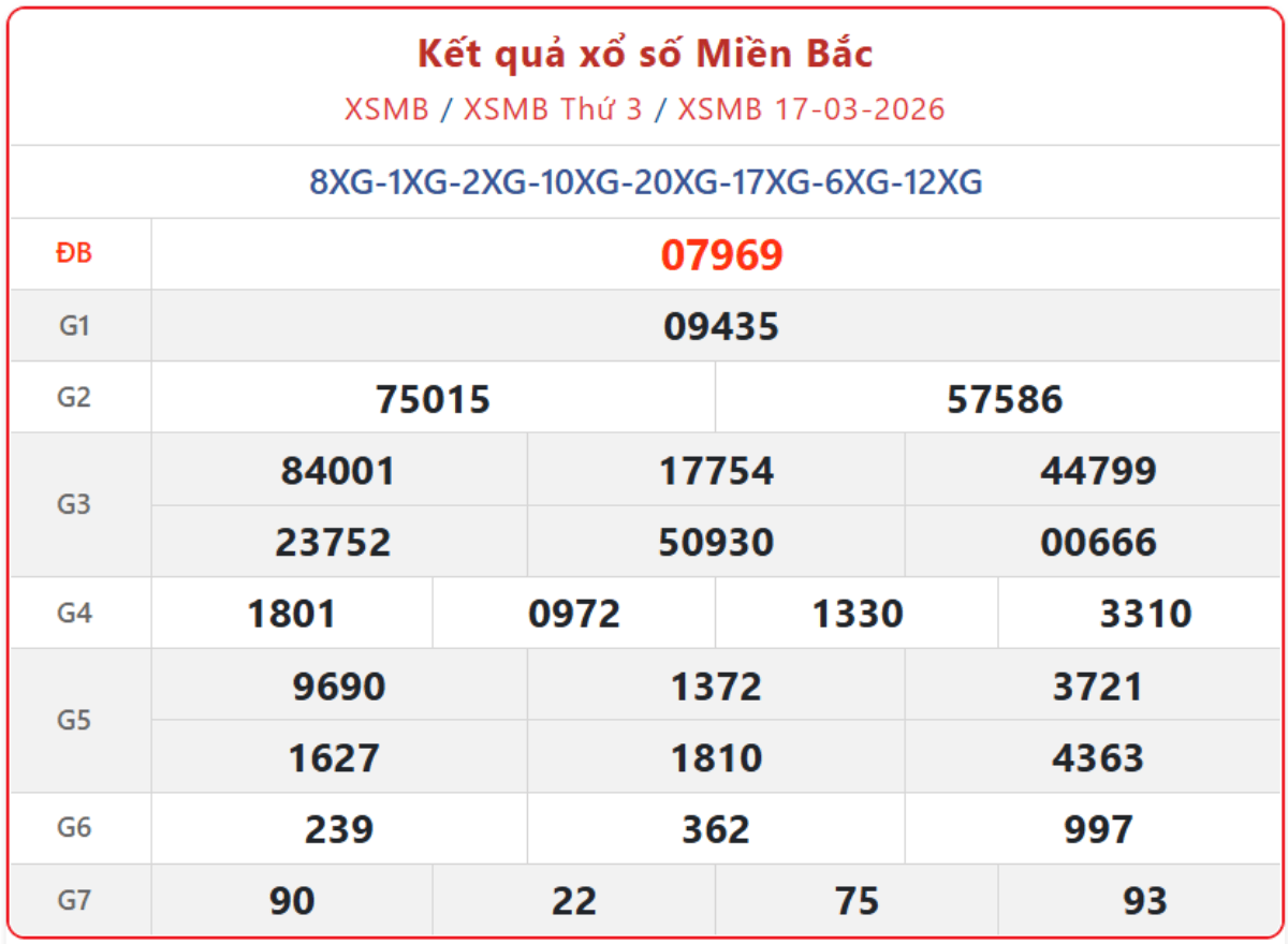 Kết quả xổ số theo giờ hôm nay ngày 17/3/2026, xem trực tiếp XSMB thứ 3 hàng tuần đầy đủ, chính xác nhất, được quay thưởng bởi Công ty xổ số kiến thiết Quảng Ninh (XSQN).