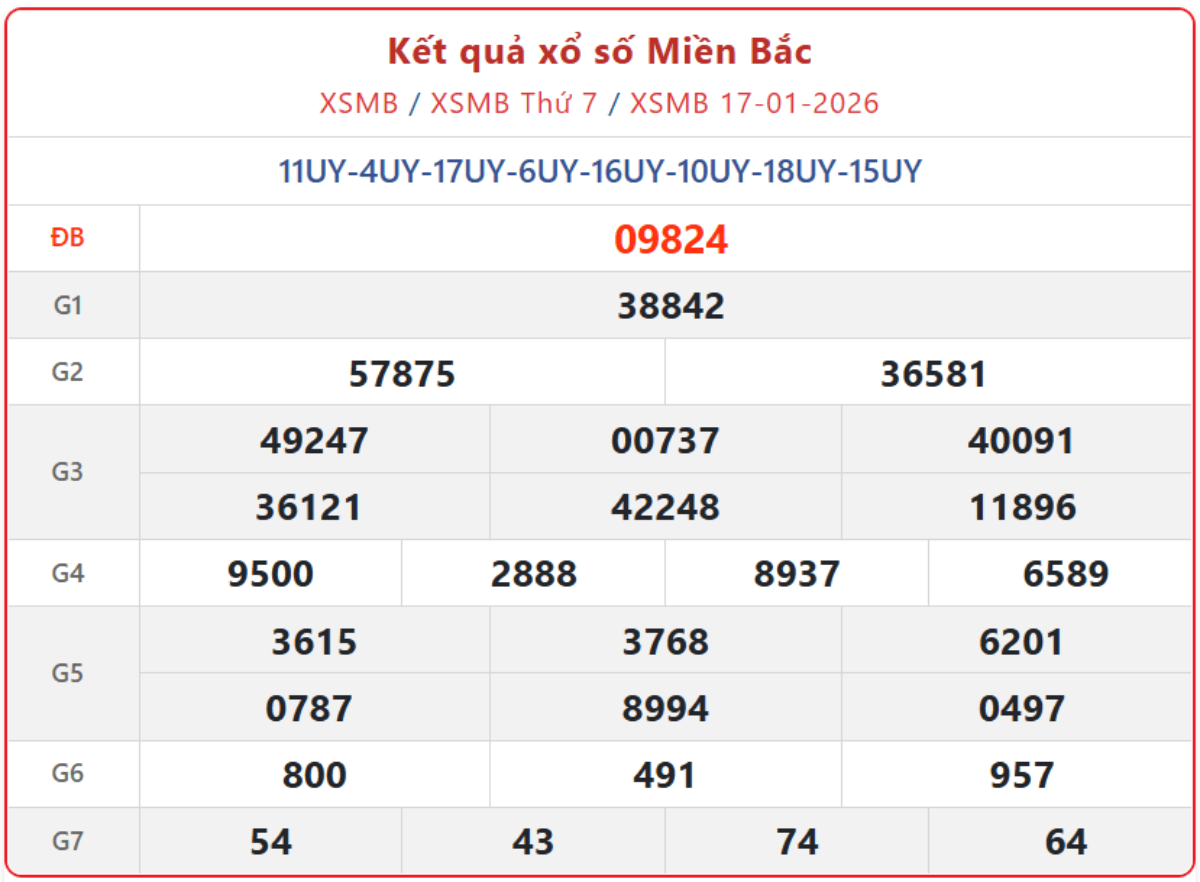 XSMB 17/1, kết quả xổ số miền Bắc (KQXSMB) ngày 17/1/2026.