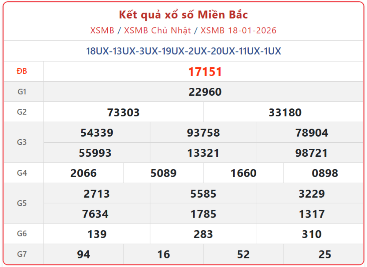 - Xổ số miền Bắc mới nhất ngày 18/1/2026. Xem lại KQXSMB ngày 18/1/2026