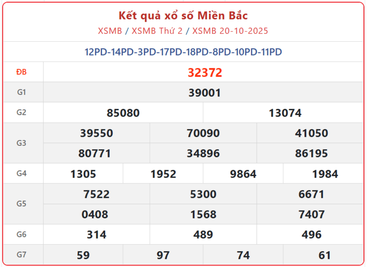 XSMB 20/10, kết quả xổ số miền Bắc (KQXSMB) ngày 20/10/2025.