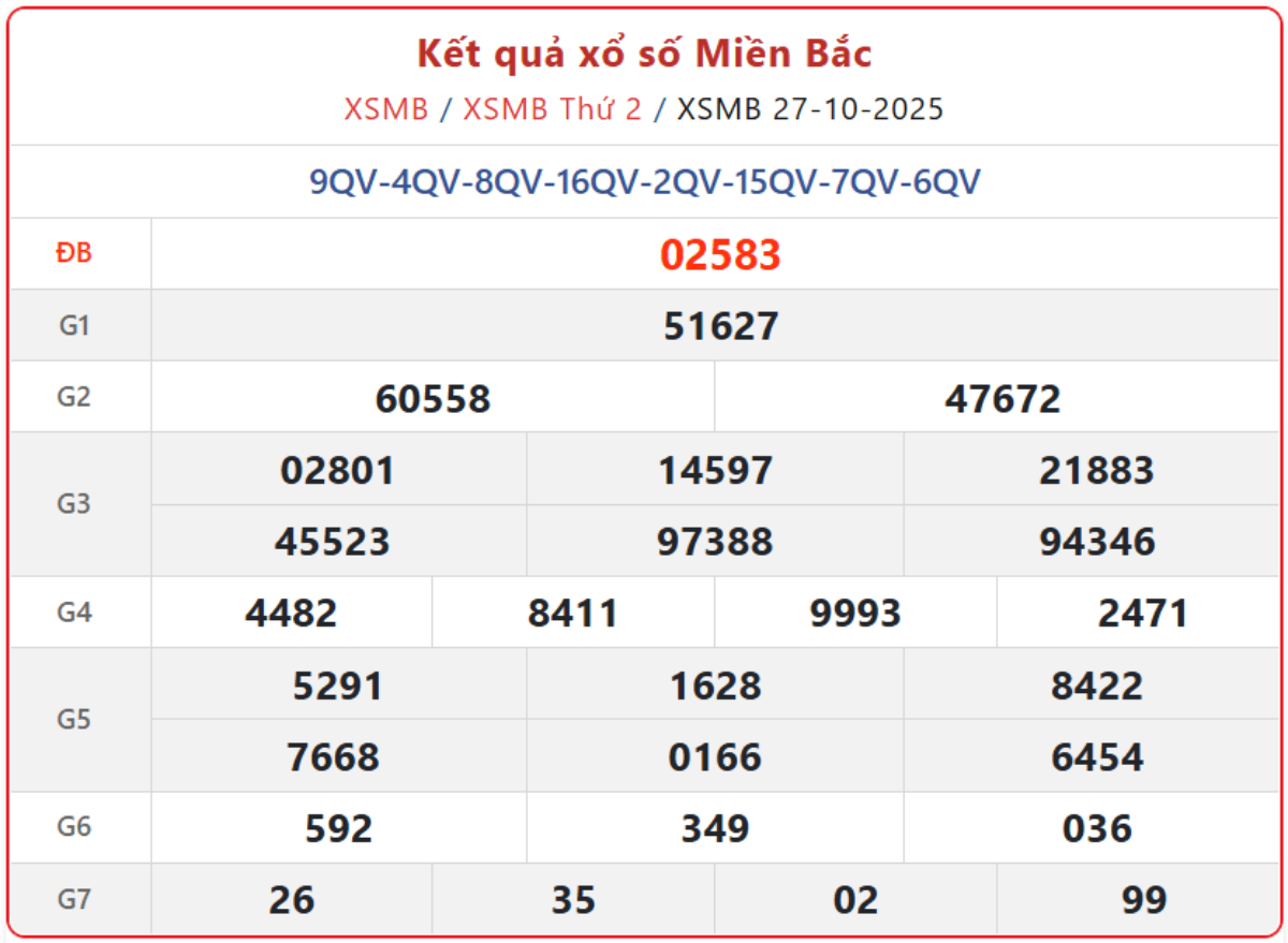 XSMB 27/10, kết quả xổ số miền Bắc (KQXSMB) ngày 27/10/2025.
