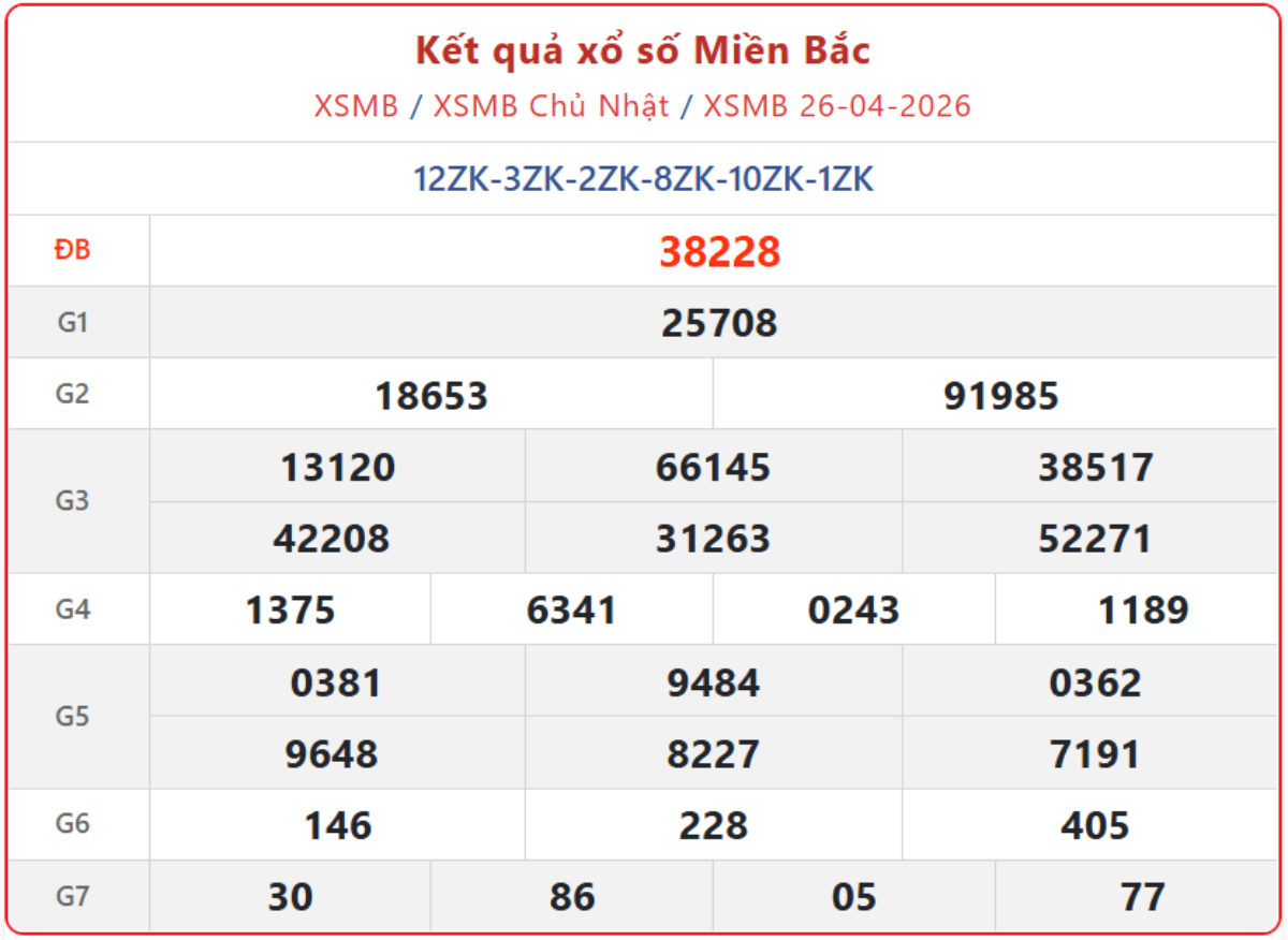 Kết quả xổ số miền Bắc ngày 26/4/2026, xem trực tiếp XSMB chủ nhật hàng tuần đầy đủ, chính xác nhất, được quay thưởng bởi Công ty xổ số kiến thiết Thái Bình (XSTB).
