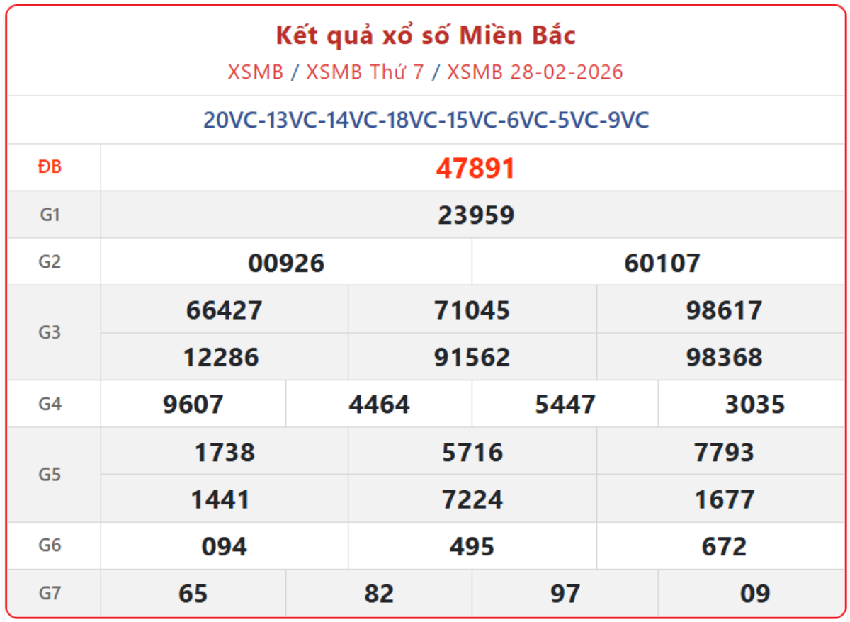Kết quả xổ số theo giờ hôm nay ngày 28/2/2026, xem trực tiếp XSMB thứ 7 hàng tuần đầy đủ, chính xác nhất, được quay thưởng bởi Công ty xổ số kiến thiết Nam Định (XSNĐ).
