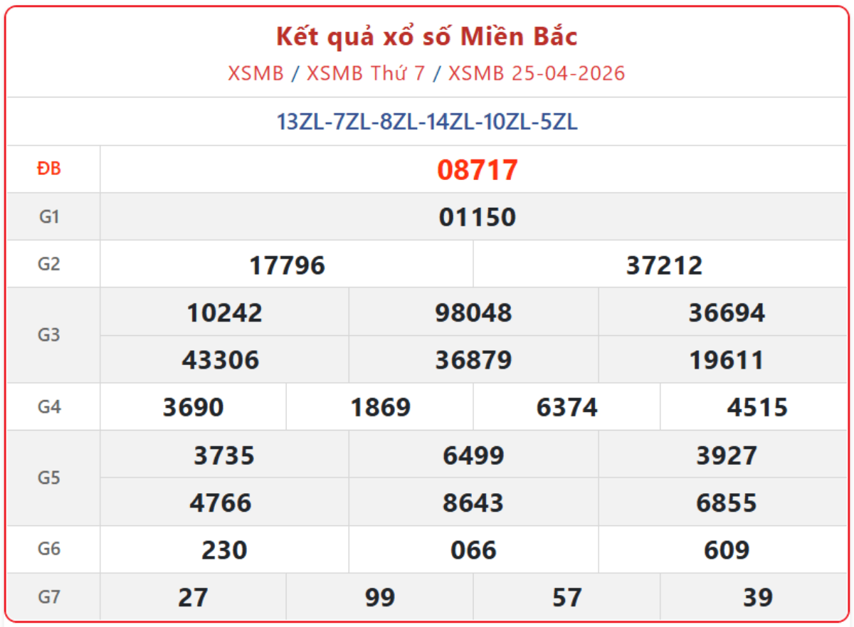 Kết quả xổ số miền Bắc ngày 25/4/2026, xem trực tiếp XSMB thứ 7 hàng tuần đầy đủ, chính xác nhất, được quay thưởng bởi Công ty xổ số kiến thiết Nam Định (XSNĐ).
