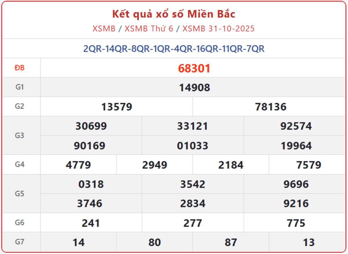 XSMB 31/10, kết quả xổ số miền Bắc (KQXSMB) ngày 31/10/2025.