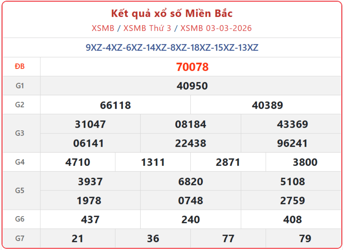 XSMB 3/3, kết quả xổ số miền Bắc (KQXSMB) ngày 3/3/2026.