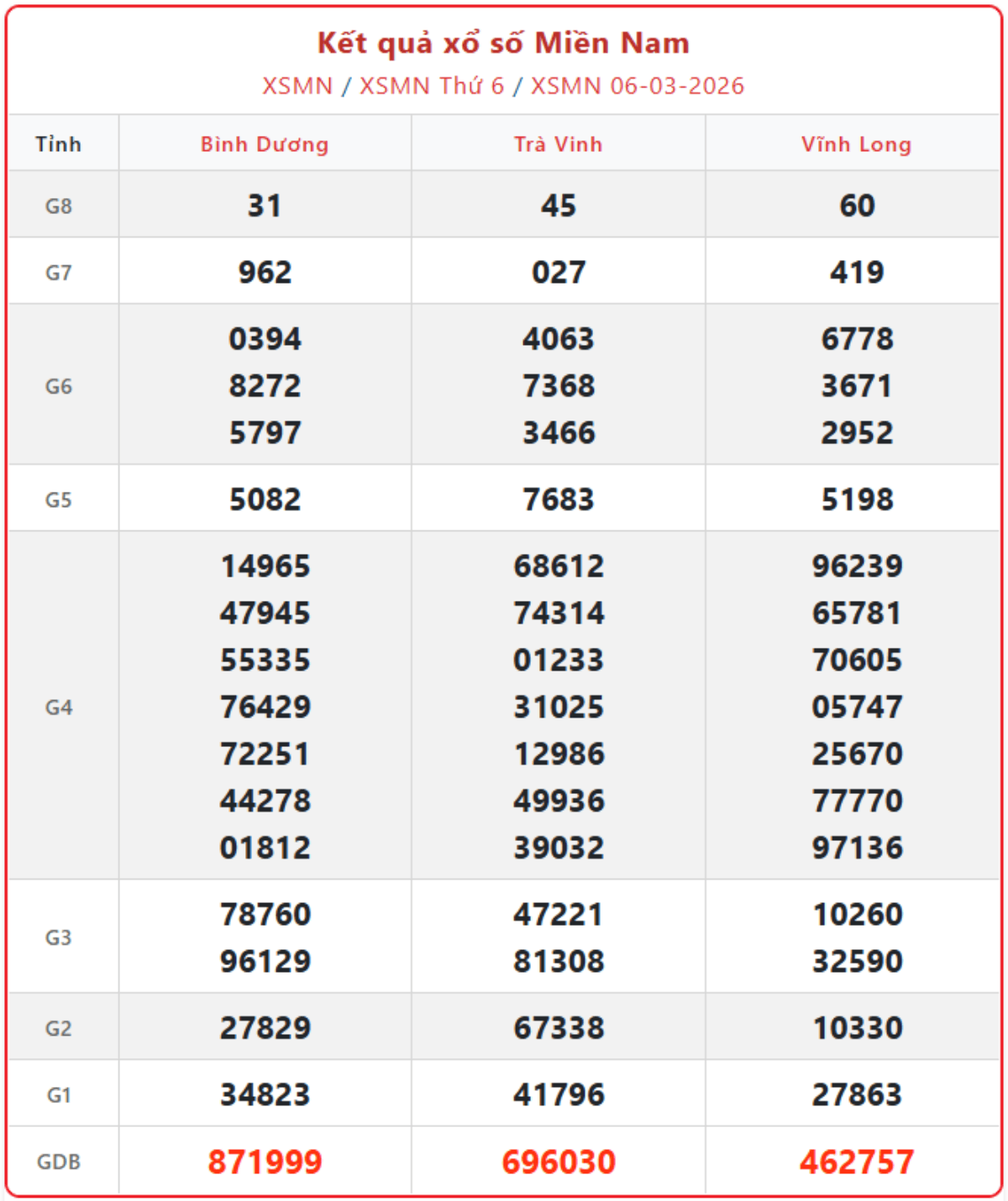 - Thứ Sáu: Xổ số miền Nam (XSMN) mở thưởng đài Bình Dương (XSBD), Vĩnh Long (XSVL) và Trà Vinh (XSTV).