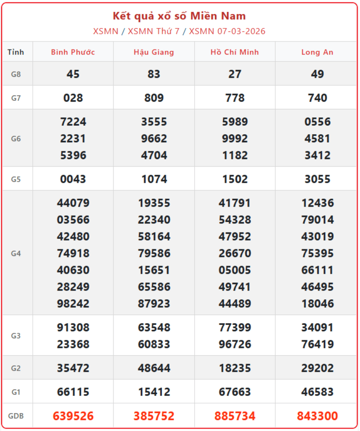 Cập nhật từng giờ xổ số miền Nam ngày 7/3/2026, KQXSMN thứ 7 hàng tuần đầy đủ, chính xác nhất.