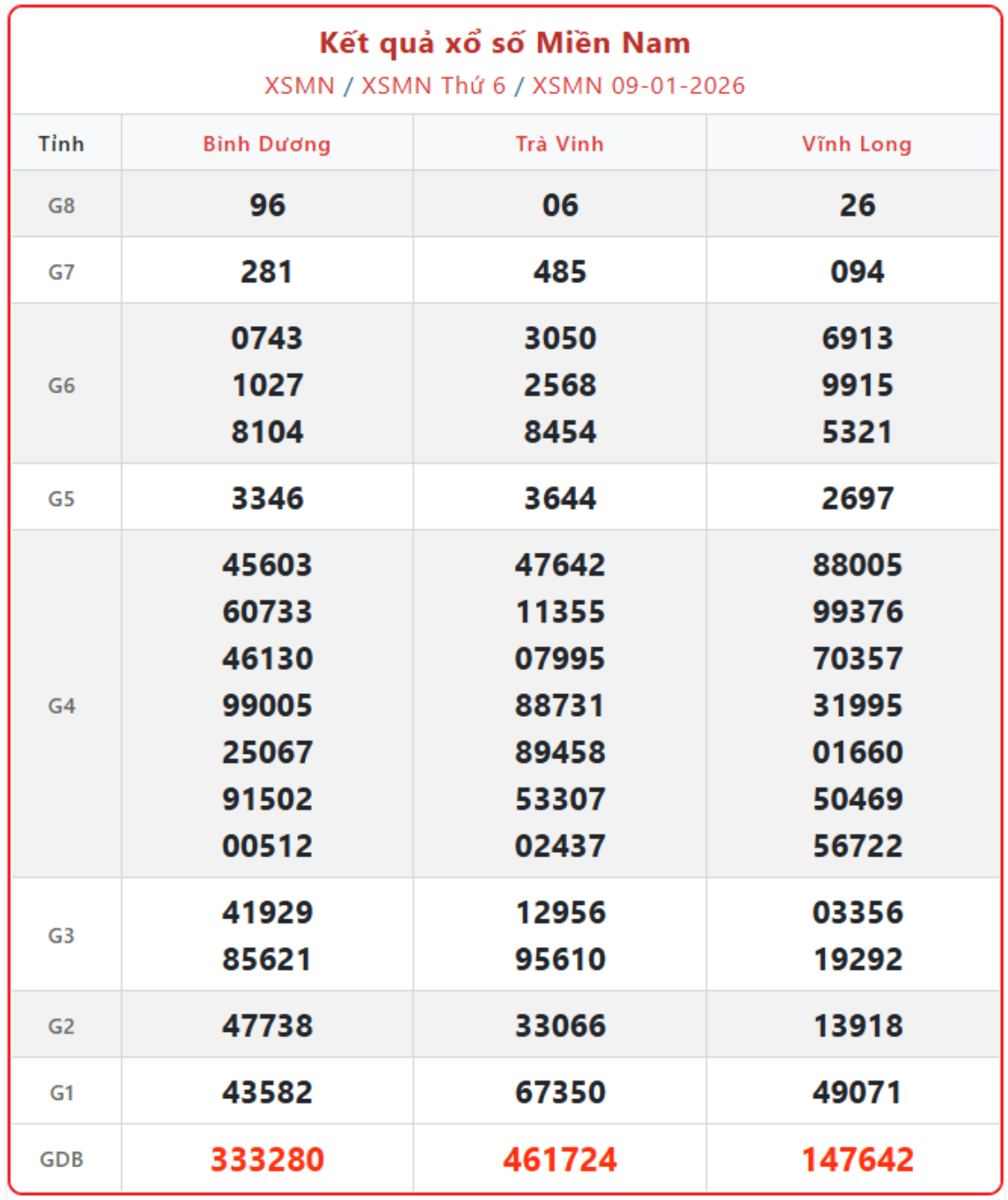 Cập nhật từng giờ xổ số miền Nam ngày 9/1/2026, KQXSMN thứ 6 hàng tuần đầy đủ, chính xác nhất.
