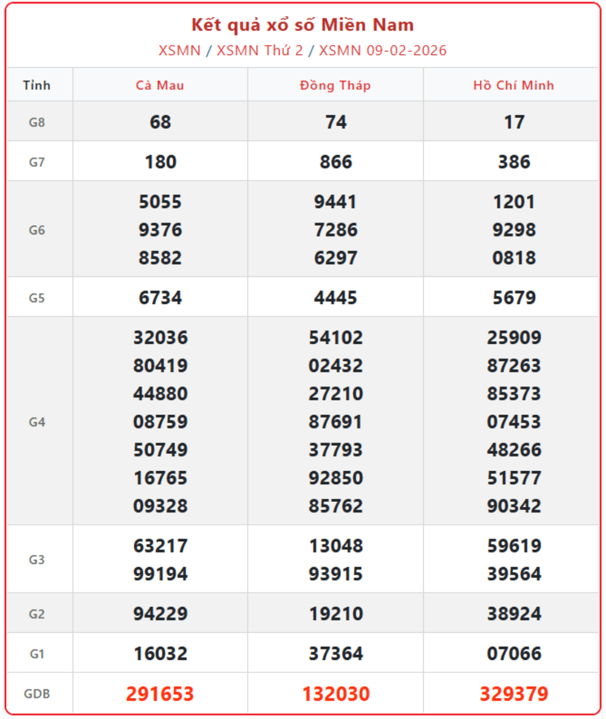Cập nhật từng giờ xổ số miền Nam ngày 9/2/2026, KQXSMN thứ 2 hàng tuần đầy đủ, chính xác nhất.
