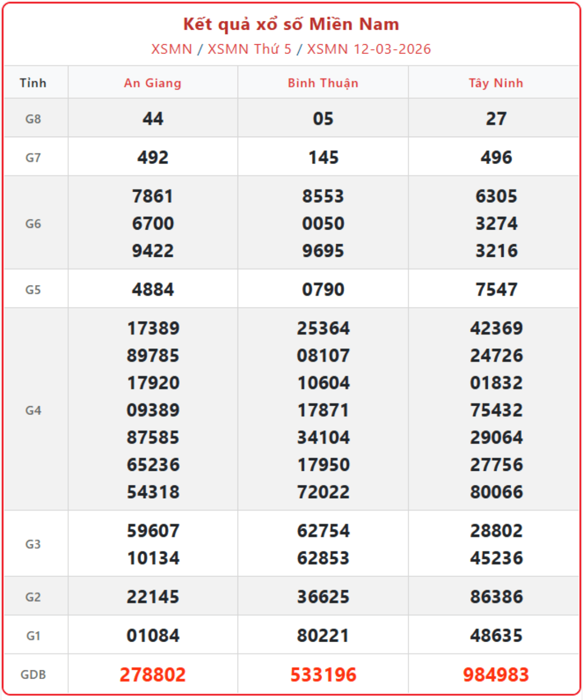 Cập nhật từng giờ xổ số miền Nam ngày 12/3/2026, KQXSMN thứ 5 hàng tuần đầy đủ, chính xác nhất.
