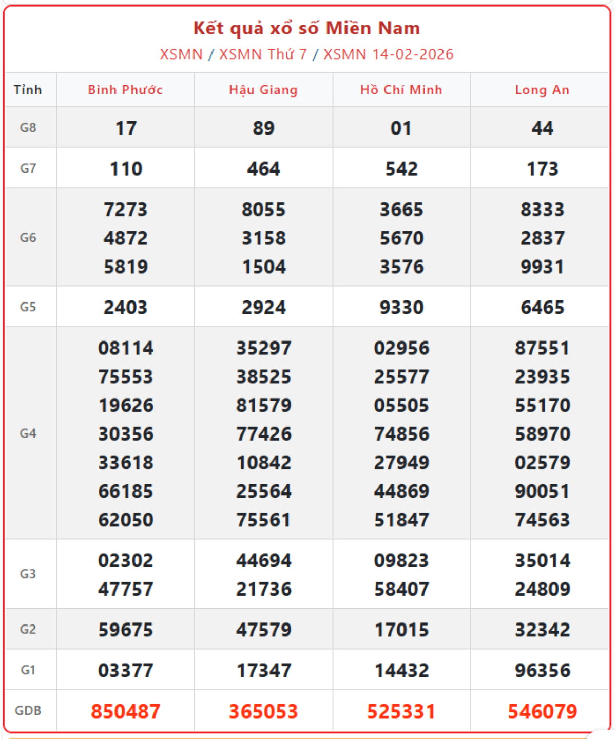 Cập nhật từng giờ xổ số miền Nam ngày 14/2/2026, KQXSMN thứ 7 hàng tuần đầy đủ, chính xác nhất.