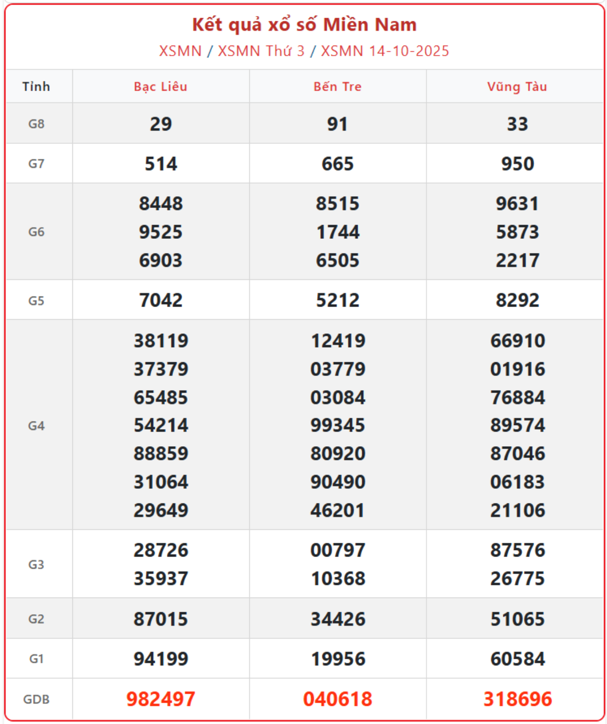Cập nhật từng giờ xổ số miền Nam ngày 14/10/2025, KQXSMN thứ 3 hàng tuần đầy đủ, chính xác nhất.