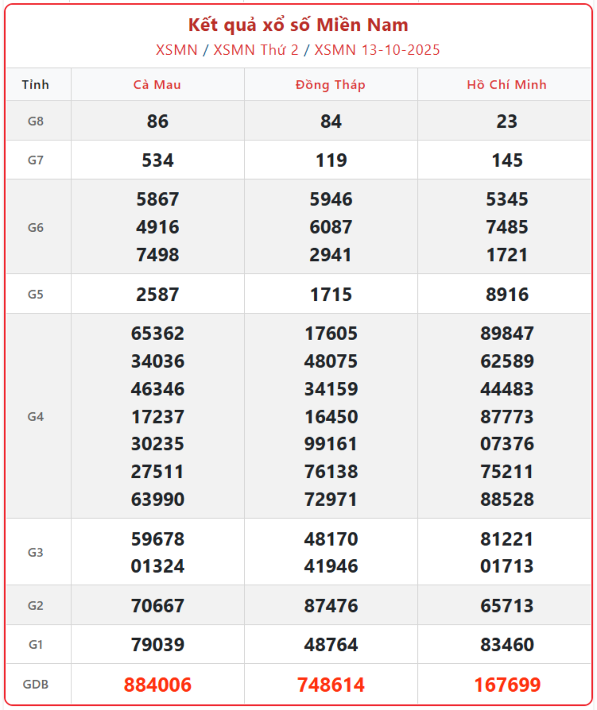 XSMN 13/10, kết quả xổ số miền Nam (KQXSMN) ngày 13/10/2025.