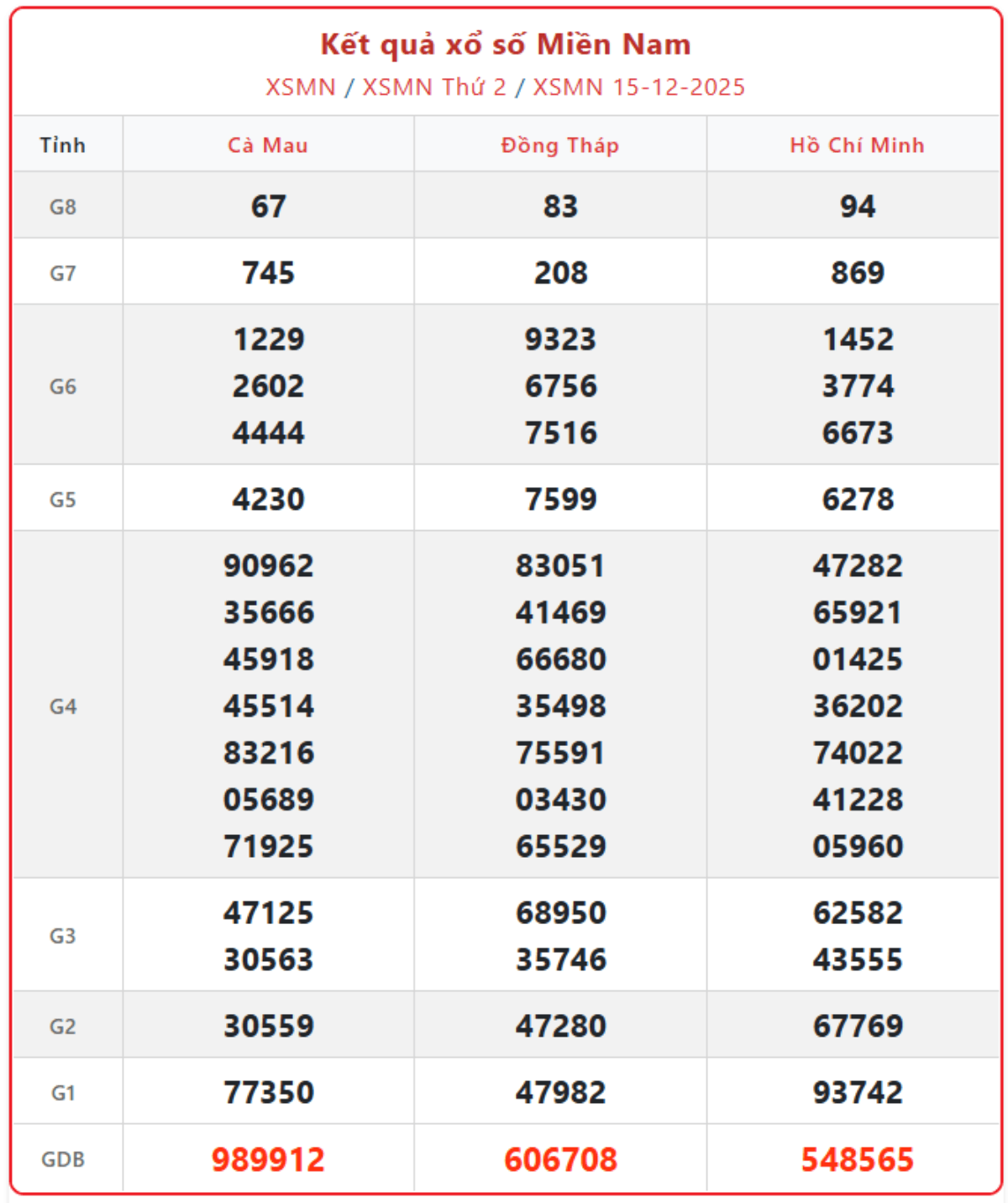 XSMN 15/12, kết quả xổ số miền Nam (KQXSMN) ngày 15/12/2025.