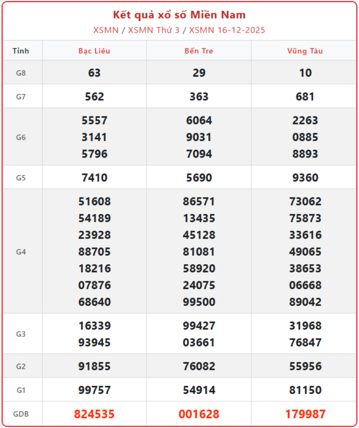 Cập nhật từng giờ xổ số miền Nam ngày 16/12/2025, KQXSMN thứ 3 hàng tuần đầy đủ, chính xác nhất.