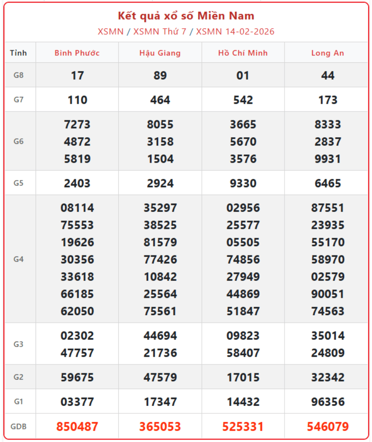 Cập nhật từng giờ xổ số miền Nam ngày 14/2/2026, KQXSMN thứ 7 hàng tuần đầy đủ, chính xác nhất.