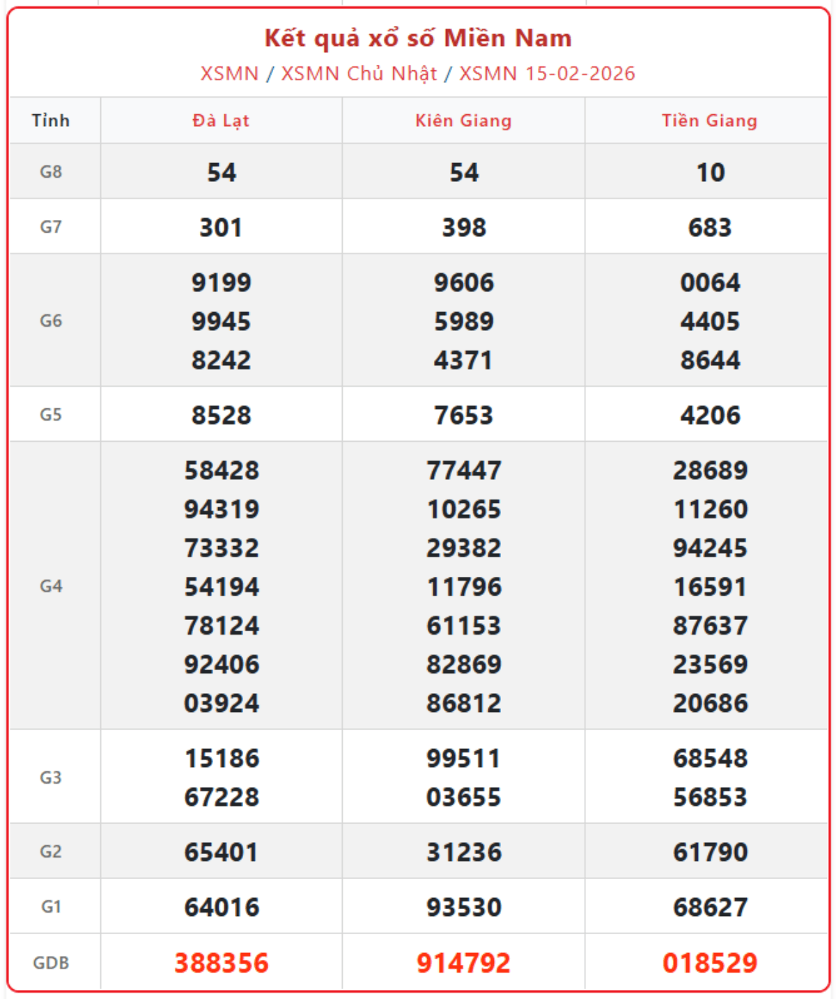 Cập nhật từng giờ xổ số miền Nam ngày 15/2/2026, KQXSMN chủ nhật hàng tuần đầy đủ, chính xác nhất.