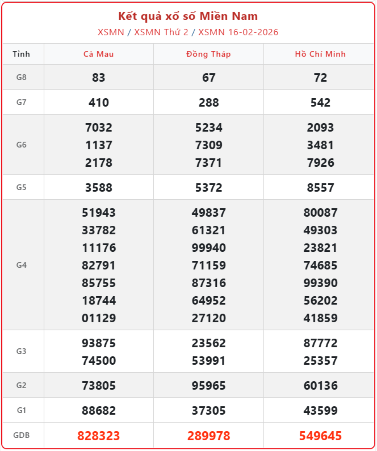 XSMN 16/2, kết quả xổ số miền Nam (KQXSMN) ngày 16/2/2026.