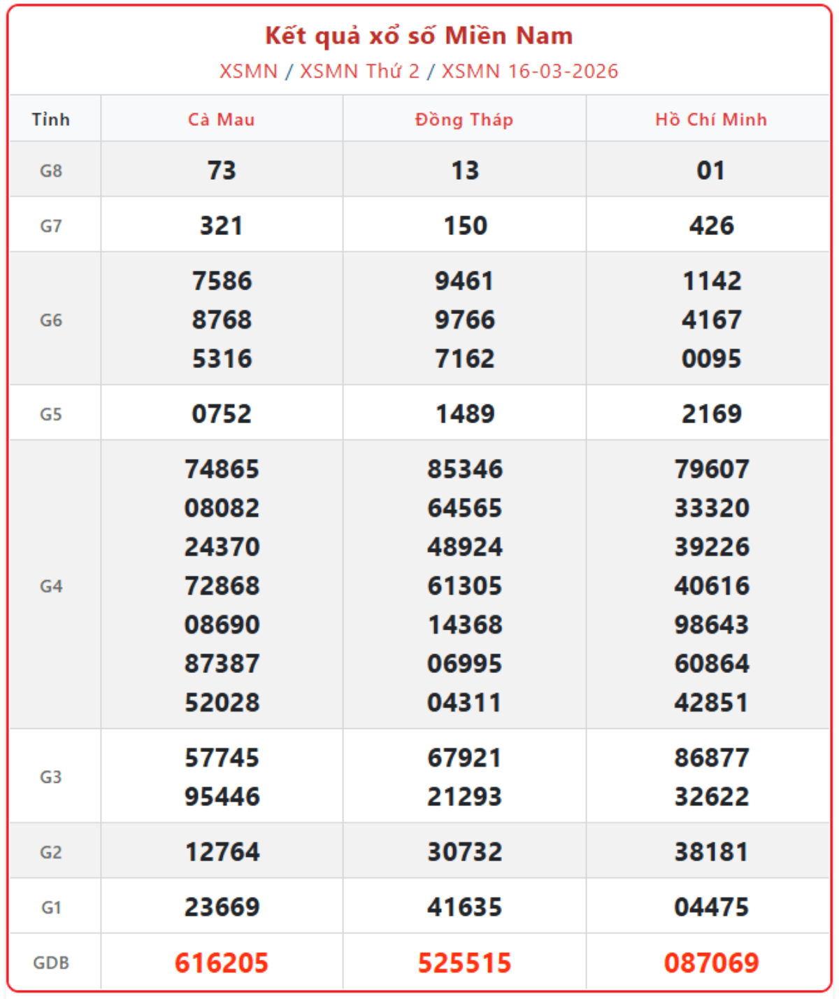 XSMN 16/3, kết quả xổ số miền Nam (KQXSMN) ngày 16/3/2026.