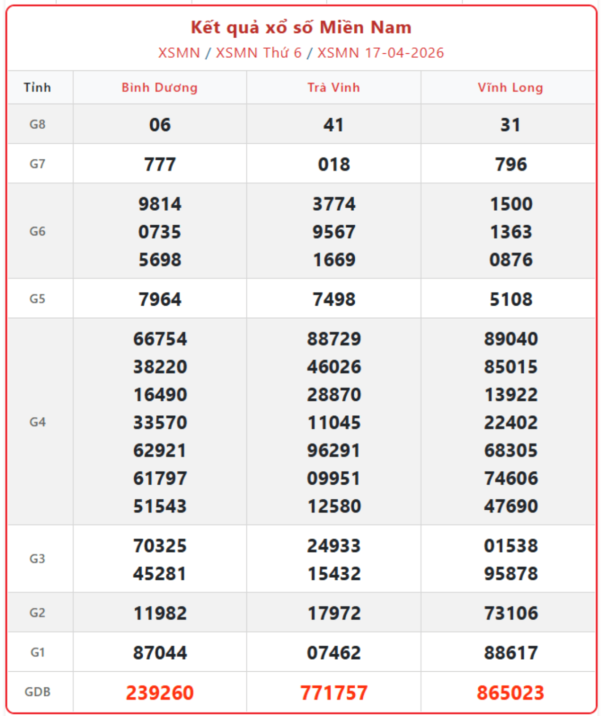 Kết quả xổ số miền Nam ngày 17/4/2026, KQXSMN thứ 6 hàng tuần đầy đủ, chính xác nhất.