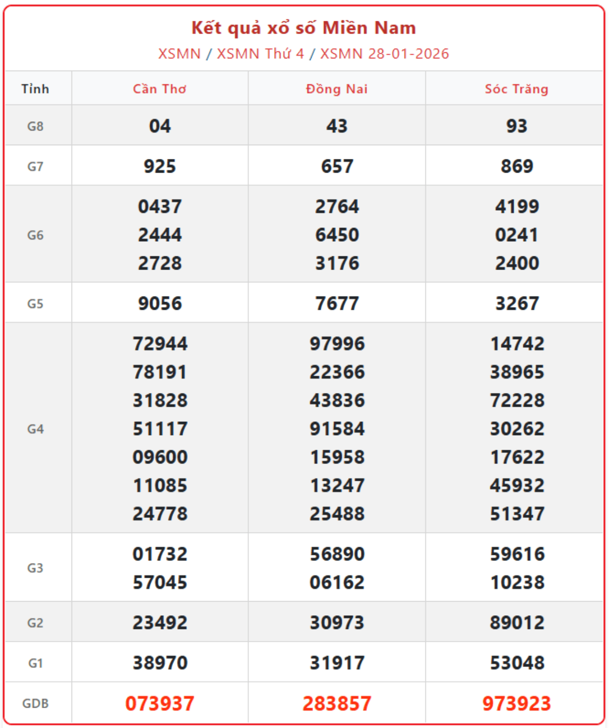 Cập nhật từng giờ xổ số miền Nam ngày 28/1/2026, KQXSMN thứ 4 hàng tuần đầy đủ, chính xác nhất.