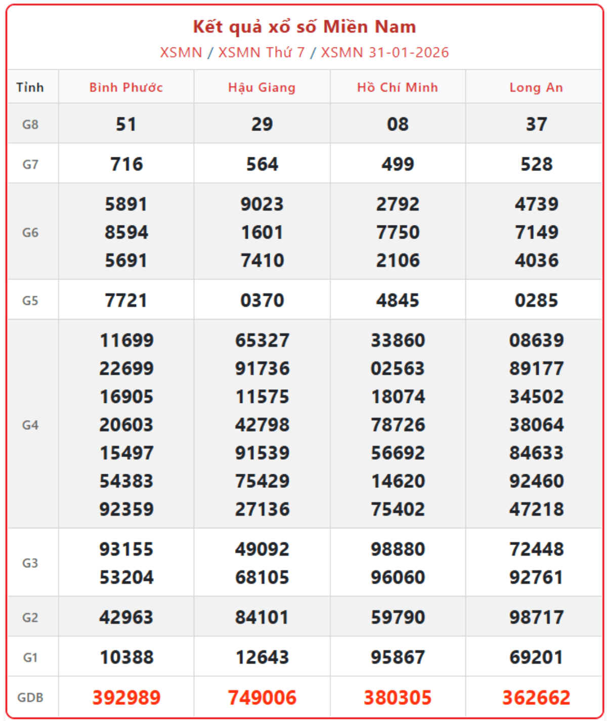 Cập nhật từng giờ xổ số miền Nam ngày 31/1/2026, KQXSMN thứ 7 hàng tuần đầy đủ, chính xác nhất.