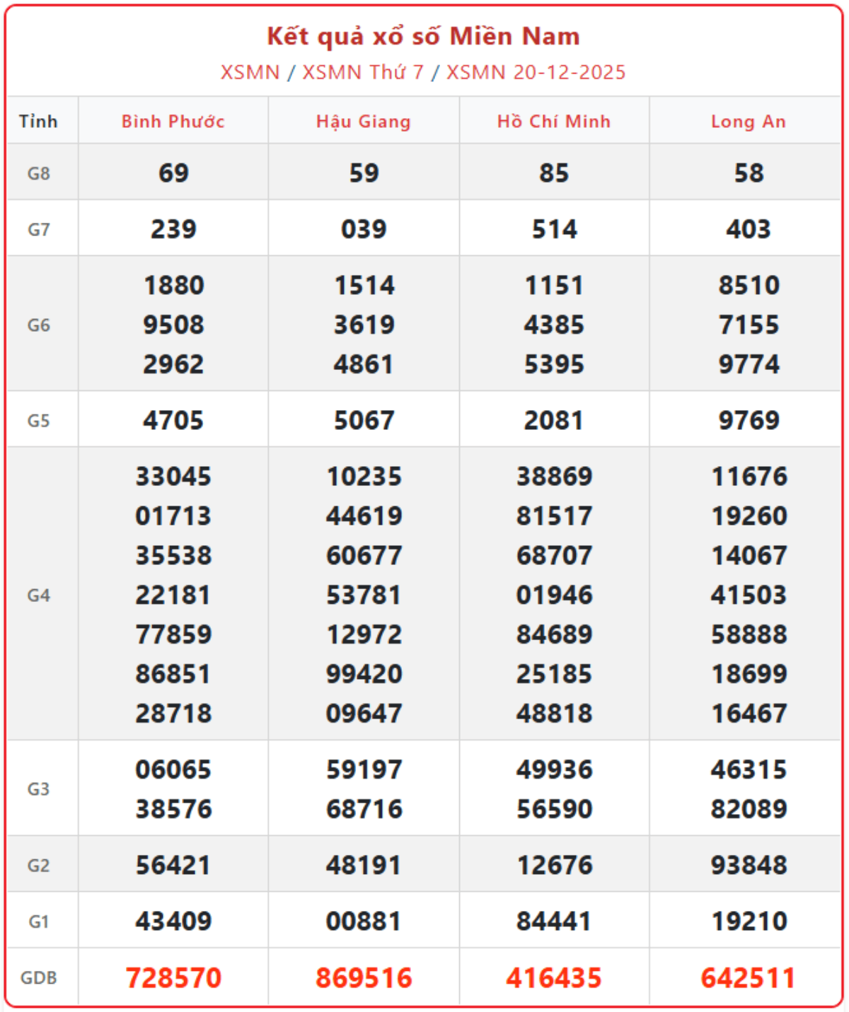 Cập nhật từng giờ xổ số miền Nam ngày 20/12/2025, KQXSMN thứ 7 hàng tuần đầy đủ, chính xác nhất.