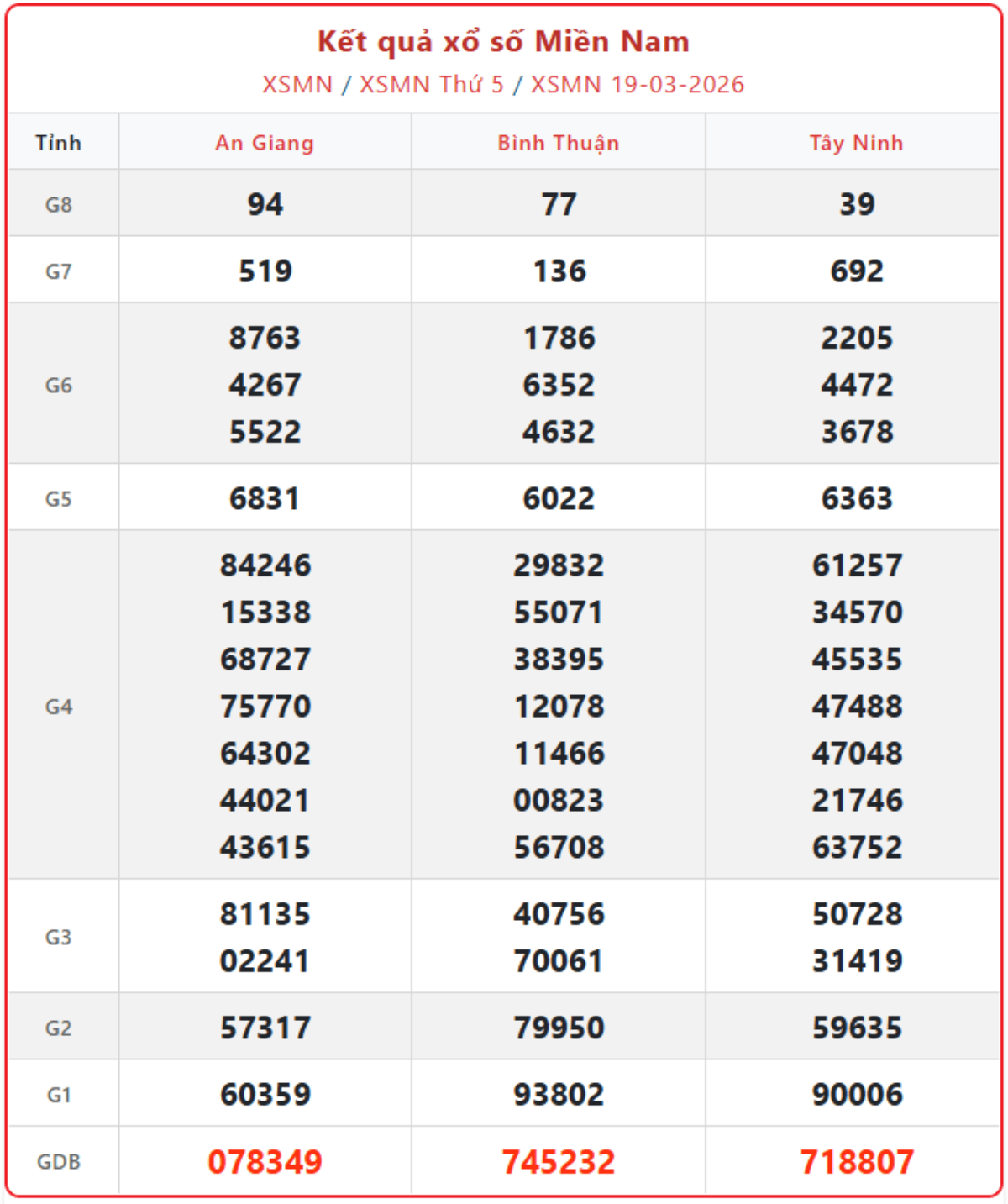 Cập nhật từng giờ xổ số miền Nam ngày 19/3/2026, KQXSMN thứ 5 hàng tuần đầy đủ, chính xác nhất.