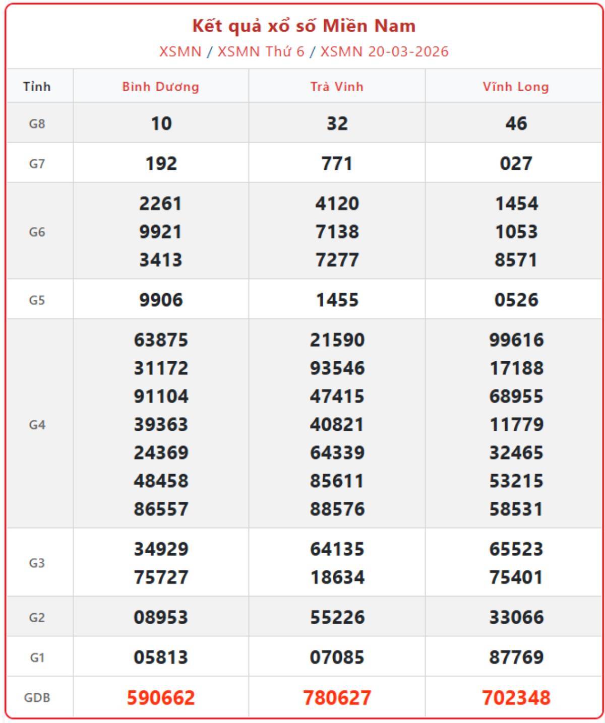Cập nhật từng giờ xổ số miền Nam ngày 20/3/2026, KQXSMN thứ 6 hàng tuần đầy đủ, chính xác nhất.
