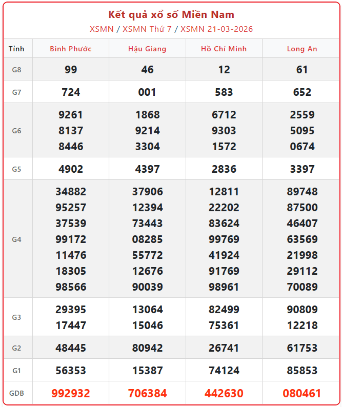Cập nhật từng giờ xổ số miền Nam ngày 21/3/2026, KQXSMN thứ 7 hàng tuần đầy đủ, chính xác nhất.