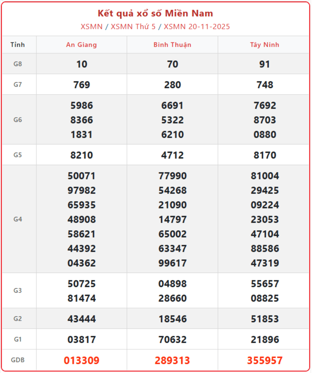 Cập nhật từng giờ xổ số miền Nam ngày 20/11/2025, KQXSMN thứ 5 hàng tuần đầy đủ, chính xác nhất.