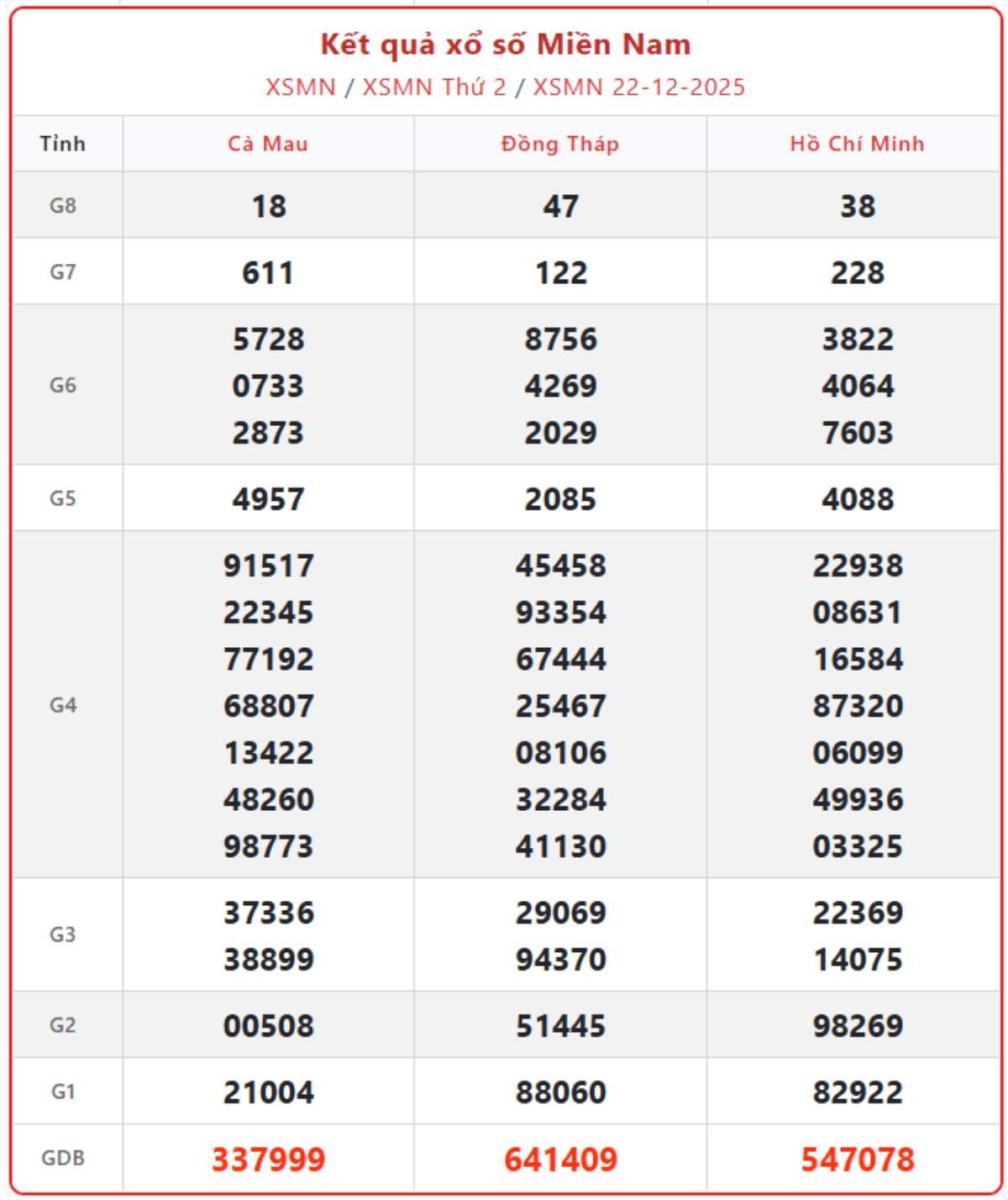 Cập nhật từng giờ xổ số miền Nam ngày 22/12/2025, KQXSMN thứ 2 hàng tuần đầy đủ, chính xác nhất.