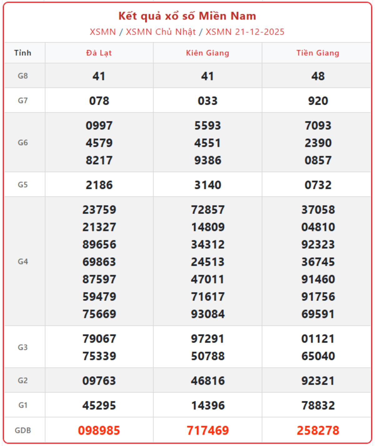 Cập nhật từng giờ xổ số miền Nam ngày 21/12/2025, KQXSMN chủ nhật hàng tuần đầy đủ, chính xác nhất.