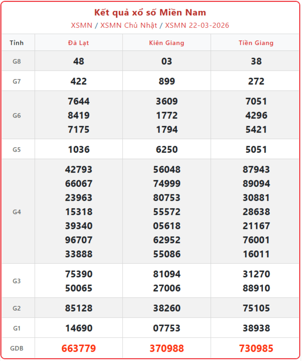 Cập nhật từng giờ xổ số miền Nam ngày 22/3/2026, KQXSMN chủ nhật hàng tuần đầy đủ, chính xác nhất.