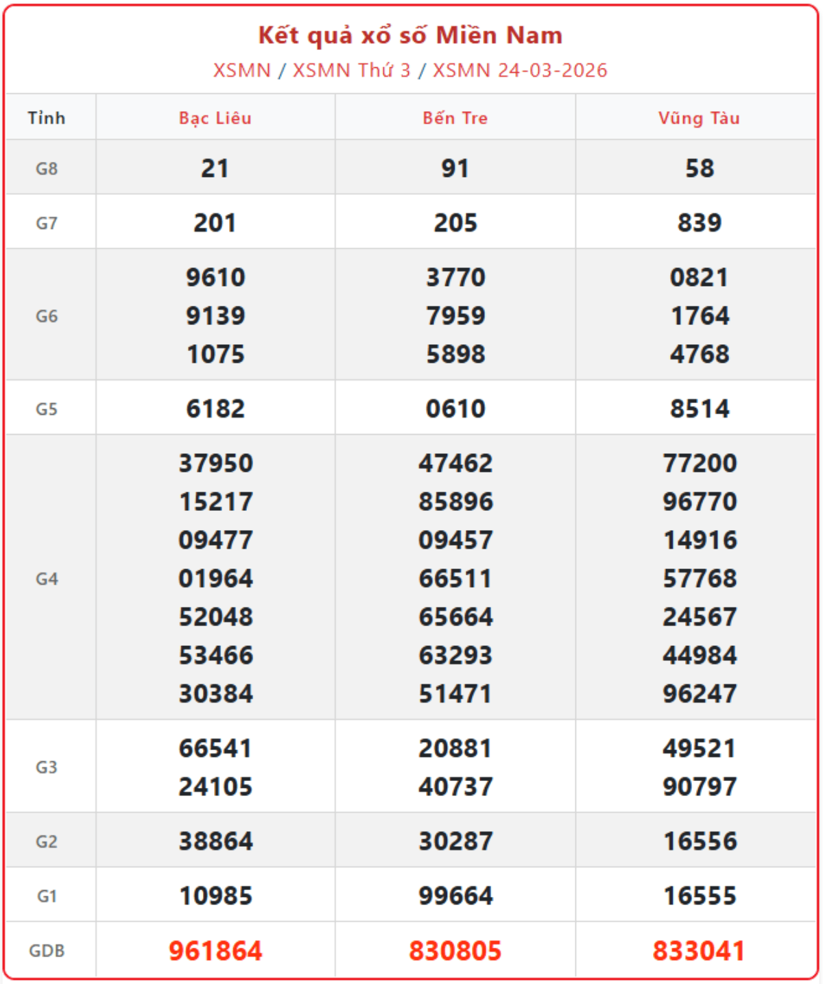 Cập nhật từng giờ xổ số miền Nam ngày 24/3/2026, KQXSMN thứ 3 hàng tuần đầy đủ, chính xác nhất.