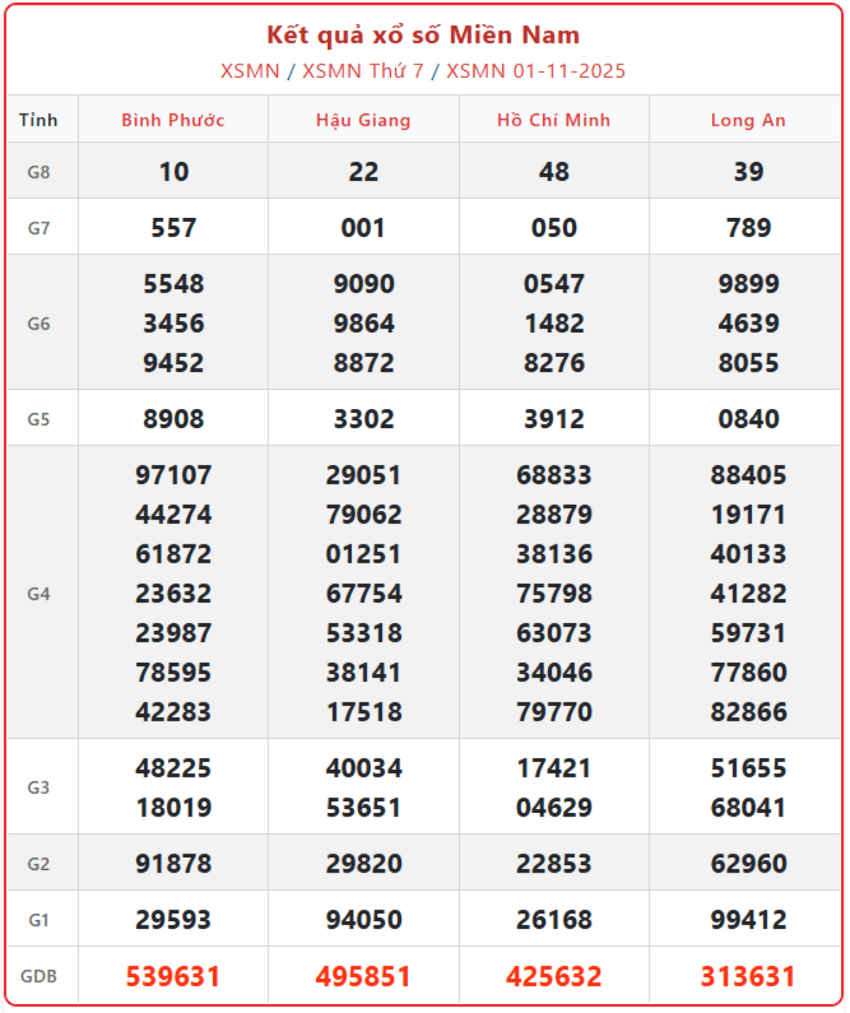 Cập nhật từng giờ xổ số miền Nam ngày 1/11/2025, KQXSMN thứ 7 hàng tuần đầy đủ, chính xác nhất.