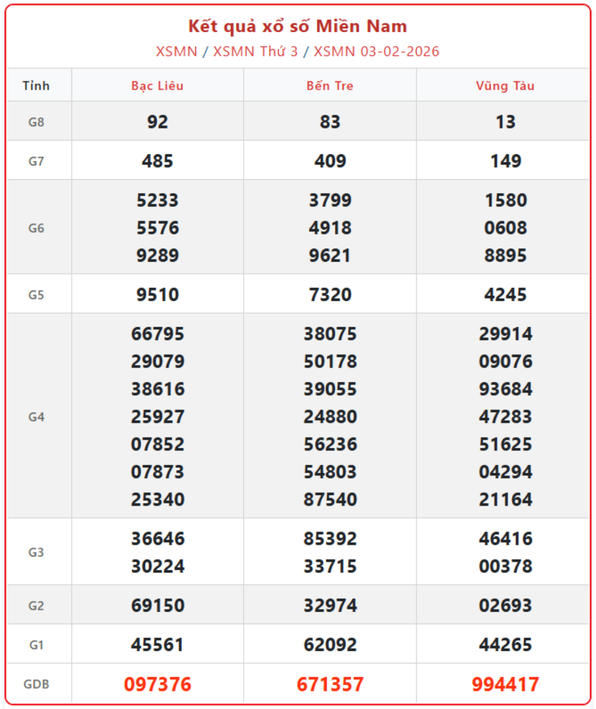 - Thứ Ba: Kết quả xổ số miền Nam do các đài Bạc Liêu (XSBL), Vũng Tàu (XSVT) và Bến Tre (XSBTR) công bố.