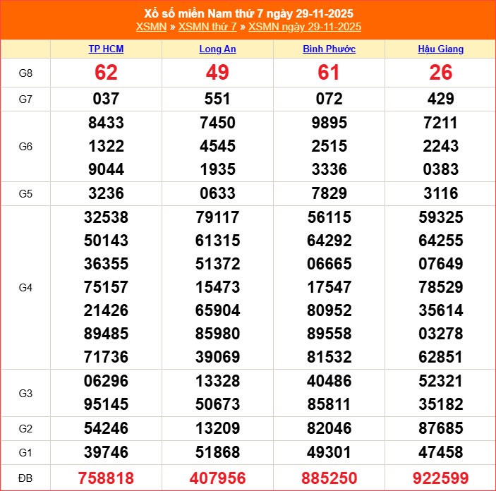 Kết quả xổ số thứ 7 ngày 29.11.2025