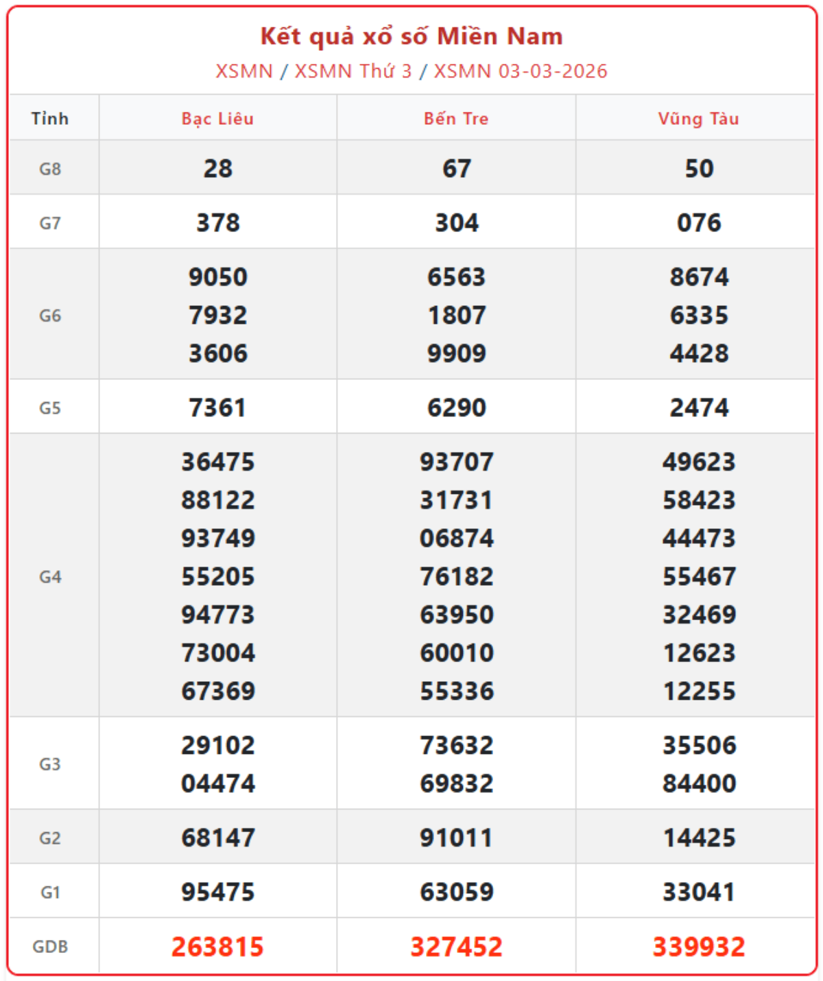 Cập nhật từng giờ xổ số miền Nam ngày 3/3/2026, KQXSMN thứ 3 hàng tuần đầy đủ, chính xác nhất.