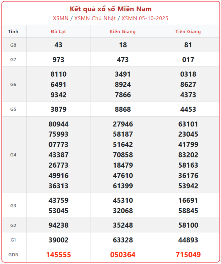 Cập nhật từng giờ xổ số miền Nam ngày 5/10/2025, KQXSMN chủ nhật hàng tuần đầy đủ, chính xác nhất.