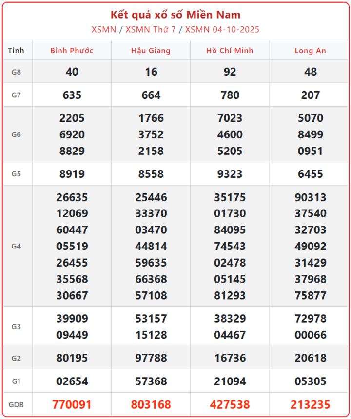 Cập nhật từng giờ xổ số miền Nam ngày 4/10/2025, KQXSMN thứ 7 hàng tuần đầy đủ, chính xác nhất.