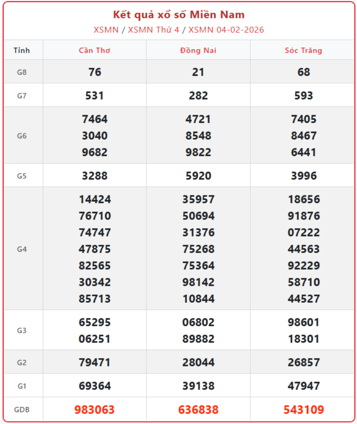 Cập nhật từng giờ xổ số miền Nam ngày 4/2/2026, KQXSMN thứ 4 hàng tuần đầy đủ, chính xác nhất.